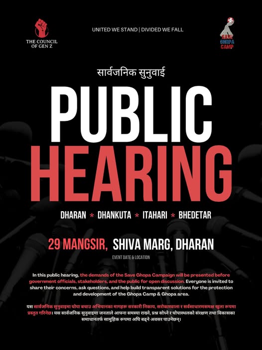 सुदन गुरुङको समर्थनमा ‘सेभ घोपा’ सार्वजनिक सुनुवाइ: धरानवासीका समस्या र माग खुल्ला रूपमा प्रस्तुत हुने