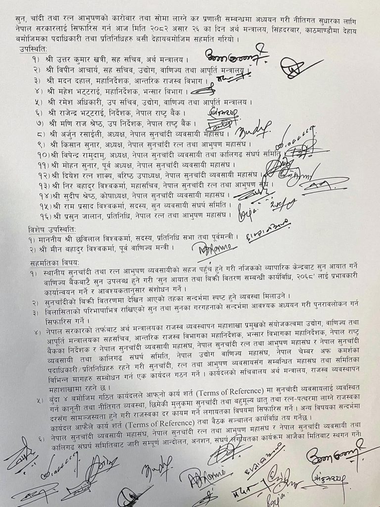 सहमति पत्रमा अर्थ मन्त्रालयका सहसचिव उत्तरकुमार खत्री, उद्योग वाणिज्य तथा आपूर्ति मन्त्रालयका सहसचिव विपिन आचार्य, आन्तरिक राजस्व विभागका महानिर्देशक मदन दाहाल, भन्सार विभागका महानिर्देशक महेश भट्टराई, नेपाल राष्ट्र बैंकका निर्देशक राजेन्द्र भट्टराई, नेपाल सुनचाँदी व्यवसायी महासंघका अध्यक्ष अर्जुन रसाइली, नेपाल सुनचाँदी रत्न तथा आभूषण महासंघका अध्यक्ष किसान सुनारलगायतले हस्ताक्षर गरेका छन्।