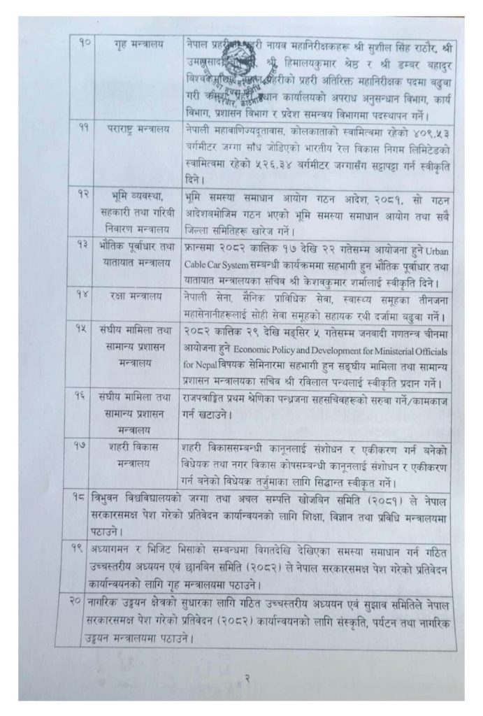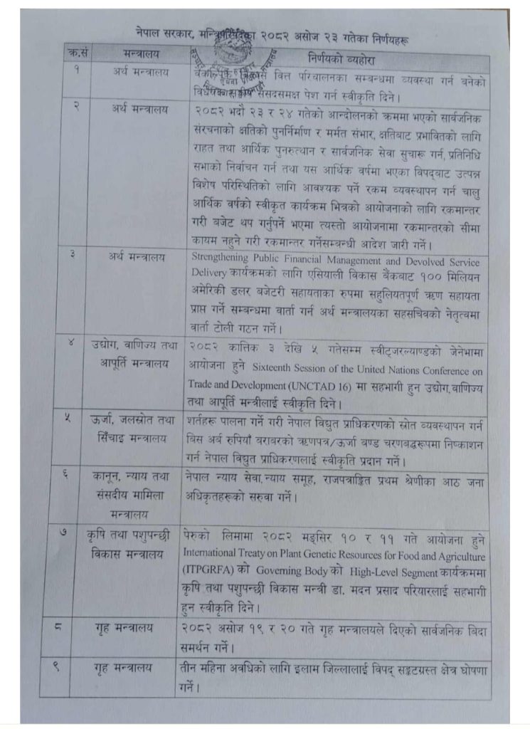 असोज २३ गते बसेको अन्तरिम सरकारको मन्त्रिपरिषद् बैठकको २० निर्णय
