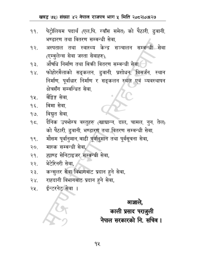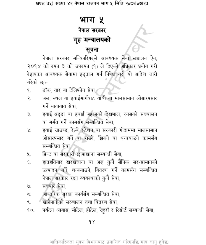 नेपालमा २५ अत्यावश्यक सेवामा हडताल निषेध, सरकारद्वारा राजपत्रमा आदेश जारी