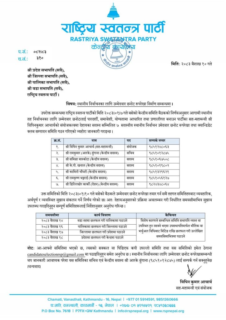 गत वैशाख ७ गते बसेको केन्द्रीय समिति बैठकको निर्णयअनुसार सह-महामन्त्री विपिनकुमार आचार्यको संयोजकत्वमा ७ सदस्यीय ‘स्थानीय निर्वाचन उम्मेदवार छनोट रूपरेखा तथा क्याण्डिडेट क्लब सम्पादन समिति’ गठन गरिएको छ। समितिमा रामकुमार ढुंगाना सचिव रहेका छन् भने सांसद समीक्षा बास्कोटा, केपी खनालसहित कामिनी चौधरी, रामकृष्ण भट्टराई र डिल्लिश्वोर कार्की सदस्य रहेका छन्।